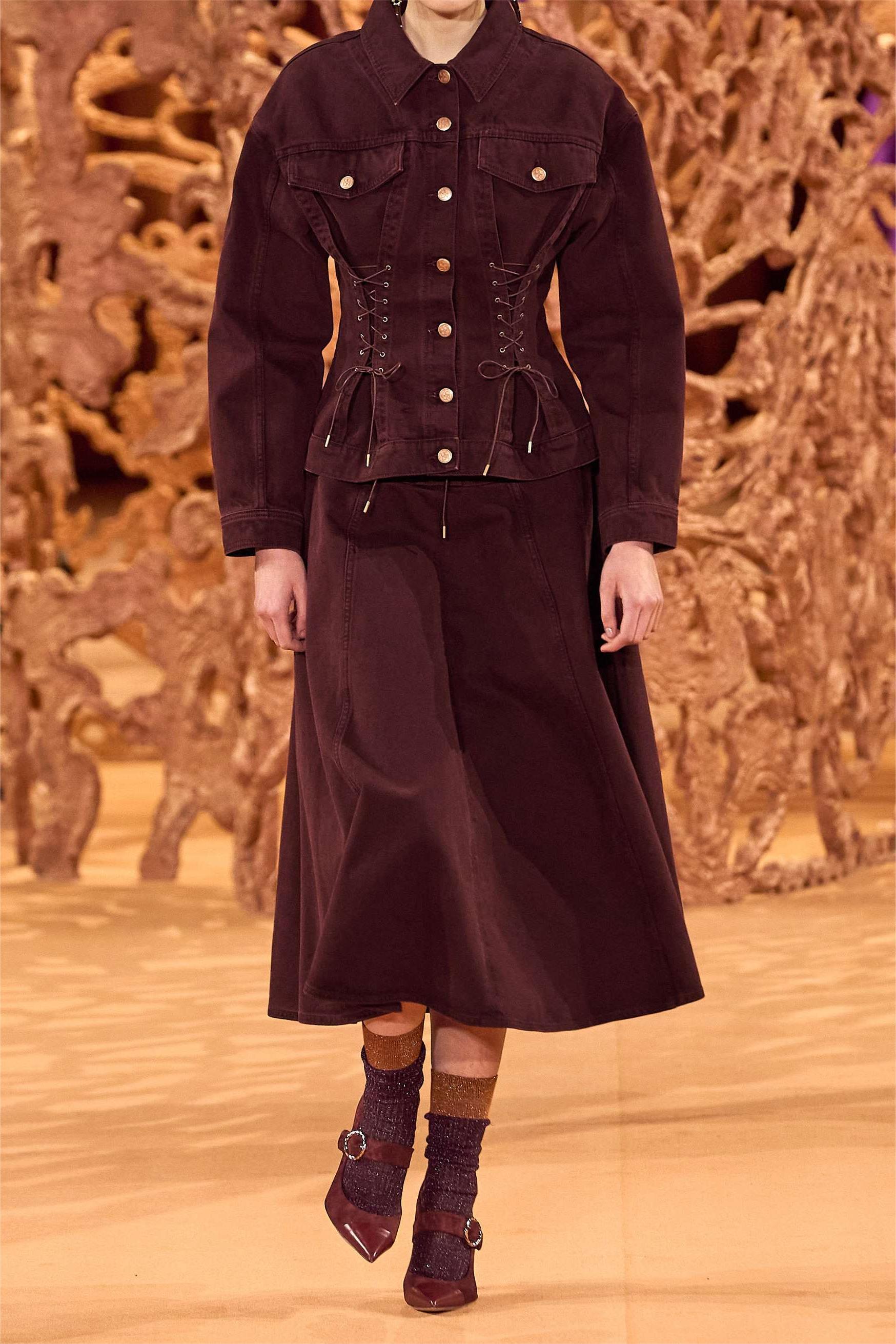 Alliez élégance et originalité avec cet ensemble en denim composé d’un manteau à lacets et d’une jupe midi taille haute.