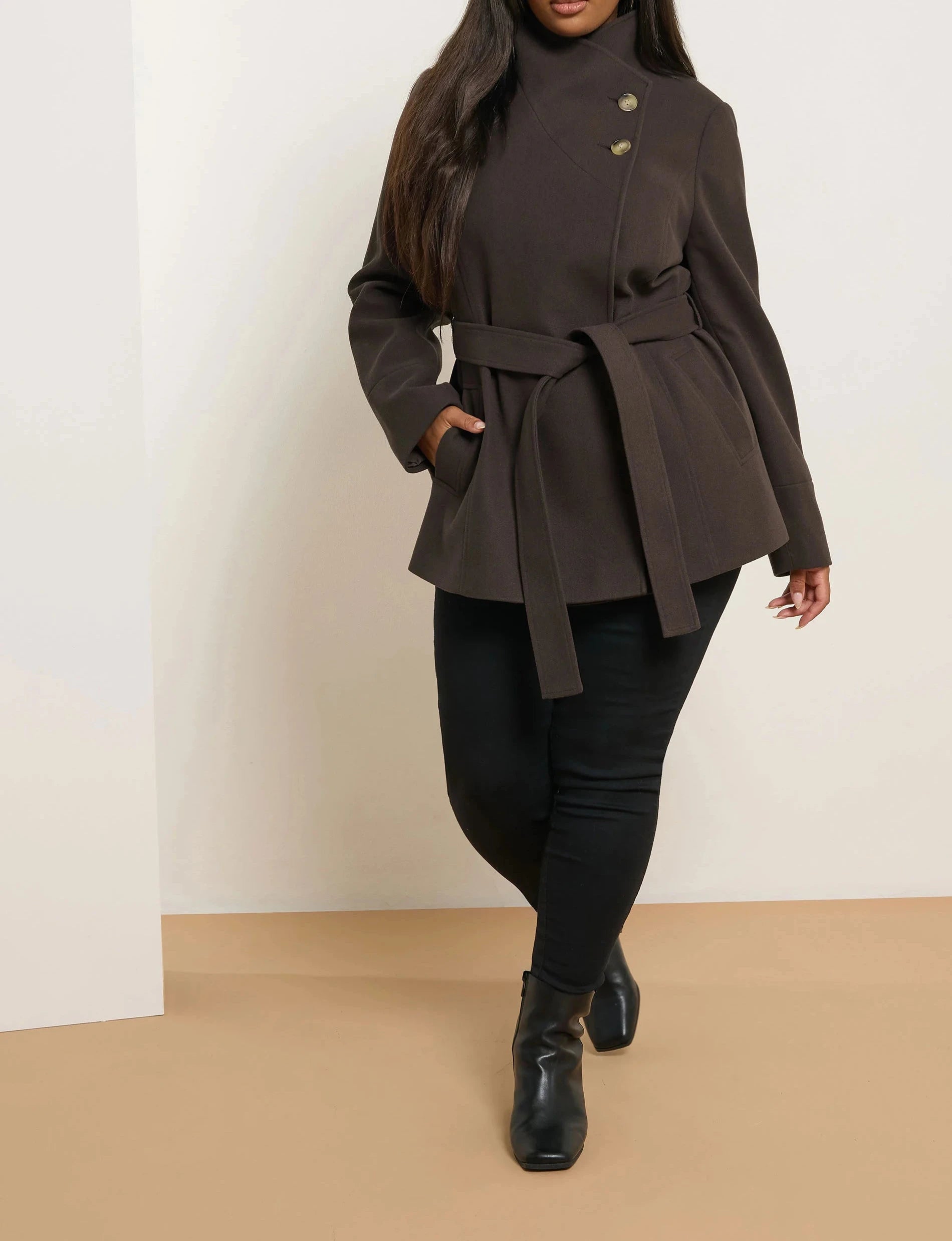 Sa coupe cache-cœur et sa ceinture à nouer subliment la silhouette avec élégance, tandis que son col montant assure confort et chaleur.