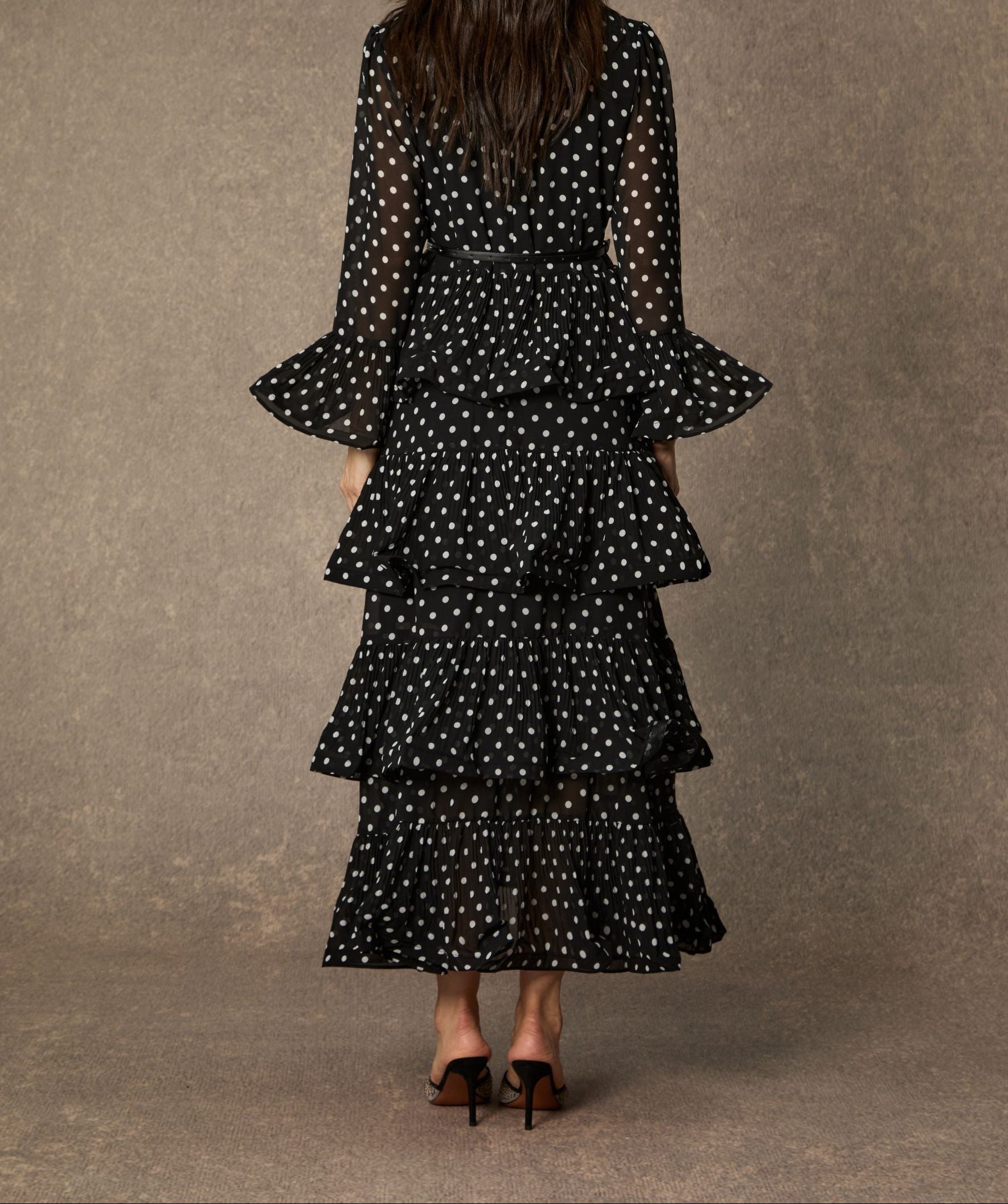 Apportez une touche de charme rétro à votre tenue avec cette robe longue à pois au nœud papillon délicat. Ses volants superposés, ses manches longues et ses poignets volantés créent une silhouette féminine et raffinée. Sa taille ceinturée met subtilement en valeur les courbes, tout en offrant un tombé fluide et harmonieux. Parfaite pour les occasions habillées comme pour les journées où l’élégance s’impose naturellement. Elle est faite à base de fibres recyclées.