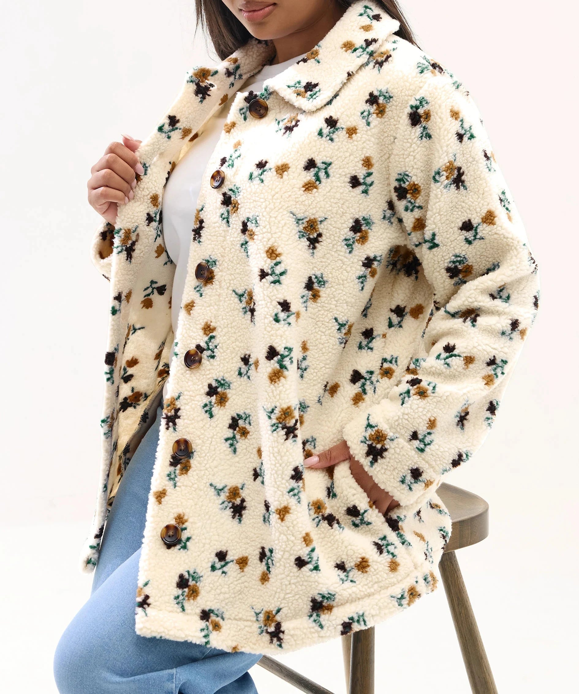 Plongez dans la douceur et l’élégance avec cette veste polaire en peluche ivoire à imprimé floral.
